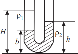 В широкую U -образную трубку с вертикальными прямыми коленами налиты подсолнечное масло и вода. На рисунке b = 12 см, h = 30 см, ρ1 — плотность подсолнечного масла, ρ2 — плотность воды. Найдите высоту столба жидкости H в левом колене. Ответ выразить в (см). Плотность воды 1000 кг/м^3. Плотность масла взять 900 кг/м^3.