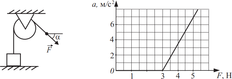 Массивный груз, покоящийся на горизонтальной опоре, привязан к лёгкой нерастяжимой верёвке, перекинутой через блок. К верёвке прикладывают силу под углом 45◦ к горизонту. Рядом на графике представлена зависимость ускорения груза от модуля силы. Выберите два верных утверждения.
