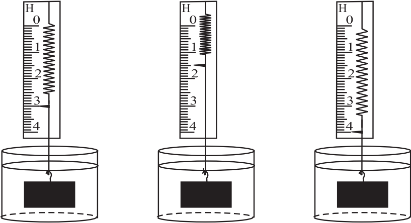 В сосуды с одинаковым объёмом воды (1000 ${кг}/{м^3}$), керосина (800 ${кг}/{м^3}$) и подсолнечного масла (920 ${кг}/{м^3}$) опускаются три одинаковых груза, вес которых в жидкости измеряется динамометром. Выберите из предложенного ниже списка два утверждения, соответствующих результатам опыта.