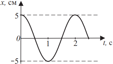 2) Уравнение колебаний в общем виде $x=x_m·sin(ω·t+ϕ_0)$. Из графика видно, что $x_m=5$см - амплитудное значение координаты и начальная фаза $ϕ_0={π}/{2}$, а циклическая частота $ω={2π}/{T}={2π}/{2}=π$Тогда: $x=5·sin(π·t+{π}/{2})$.