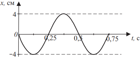 1) Из графика видно, что период колебаний тела $T=0.5с$, амплитудное значение координаты $x_m=4$см. Значит, угловая частота тела $ω={2π}/{T}={2π}/{0.5}=4π$. Запишем уравнение колебаний в общем виде: $x=x_m·sin(ωt+ϕ_0)$. В нашем случае колебания происходят по закону синуса, т.к. мы видим график синусоиды, проходящей через начало координат точку с координатами (0;0) и начальной фазой $ϕ_0=π$. Запишем уравнение: $x=4·sin(4πt+π)$.