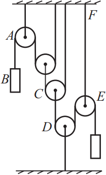 Будем отсчитывать блоки слева направо. На левой нити второго блока сила натяжения равна ${T}/{2}$, следовательно, чтобы блок оставался в равновесии, на центр блока действует сила $T$. Аналогично второму блоку на центр третьего блока действует сила $2T$, тогда сила натяжения, действующая на участок нити СD равна $2T$. Такая же сила натяжения будет на правой нити четвертого блока. Чтобы пятый блок находился в равновесии, необходимо, чтобы центр блока действовала сила $4T$.