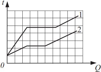 - Удельная теплоёмкость первого вещества в жидком состоянии больше удельной теплоёмкости второго вещества в жидком состоянии.