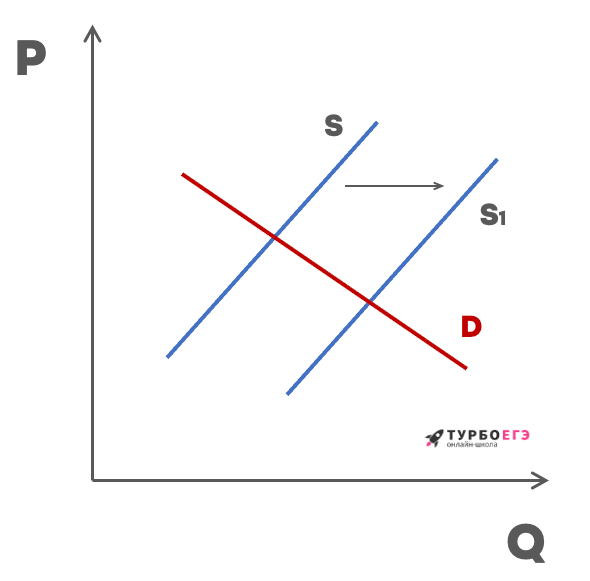 На графике изображено изменение ситуации на рынке занятий йогой в стране Т. Предложение переместилось из положения S в положение S1 при неизменном спросе D. (На графике Р — цена товара; Q — количество товара.)